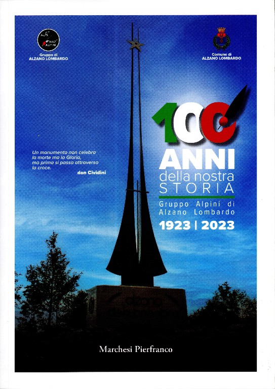 “Questo libro è il completamento della nostra storia fino al centenario aggiornando il precedente libro “la nostra storia 1923-2008”. Con queste parole, pronunciate alla presentazione ufficiale dell'opera, l'autore, il socio alpino Pierfranco Marchesi, intendeva dire che la parte principale del suo lavoro era stata aggiornare, rivedere alcuni pezzi, inserendo nuovi particolari e completando la storia con la parte mancante dal 2008 al 2022 utilizzando testimonianze dirette e indirette per la maggior parte dei tanti amici Alpini.